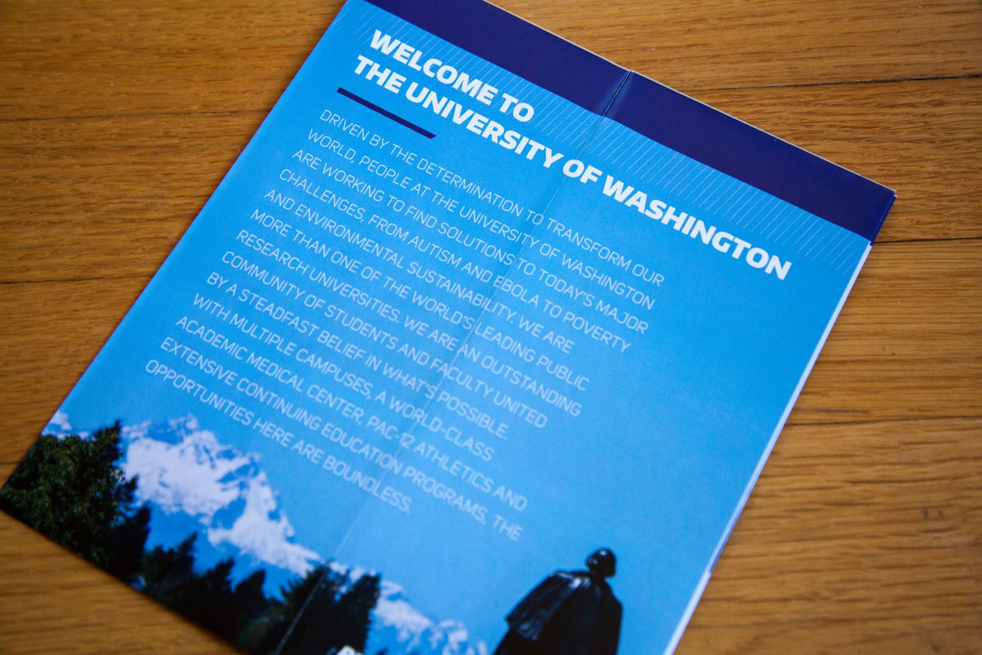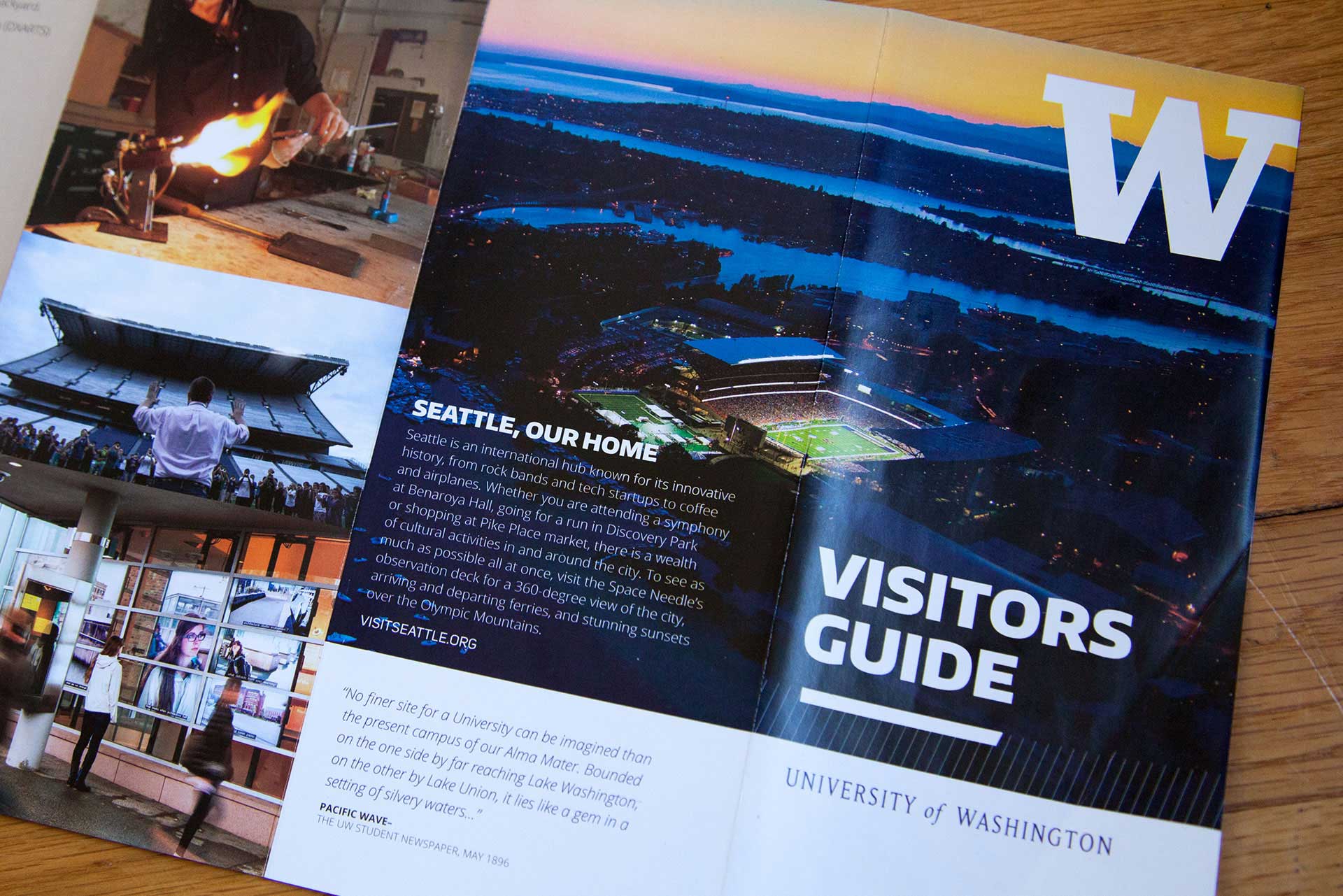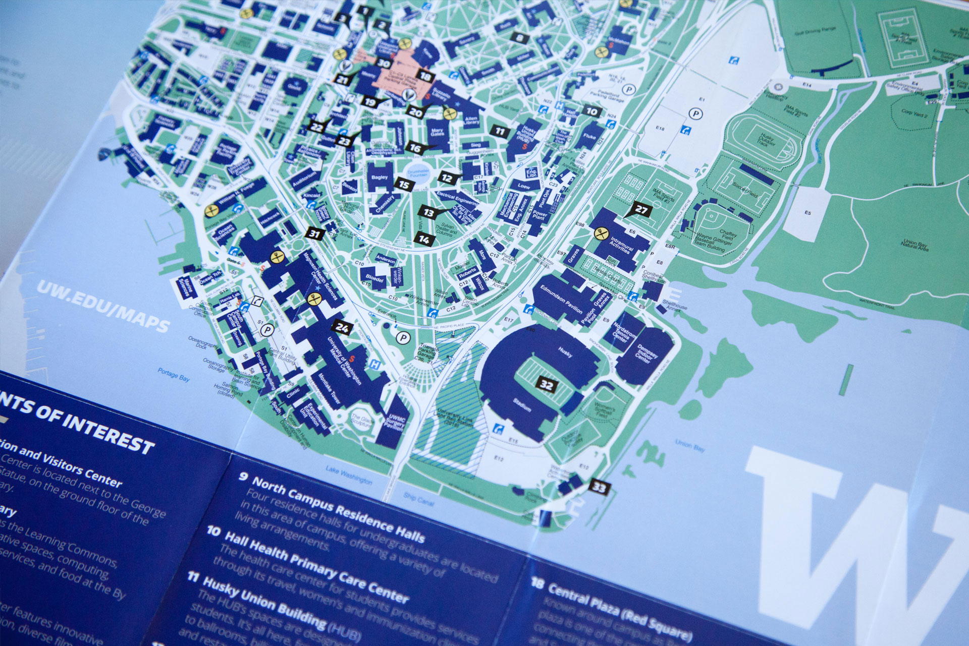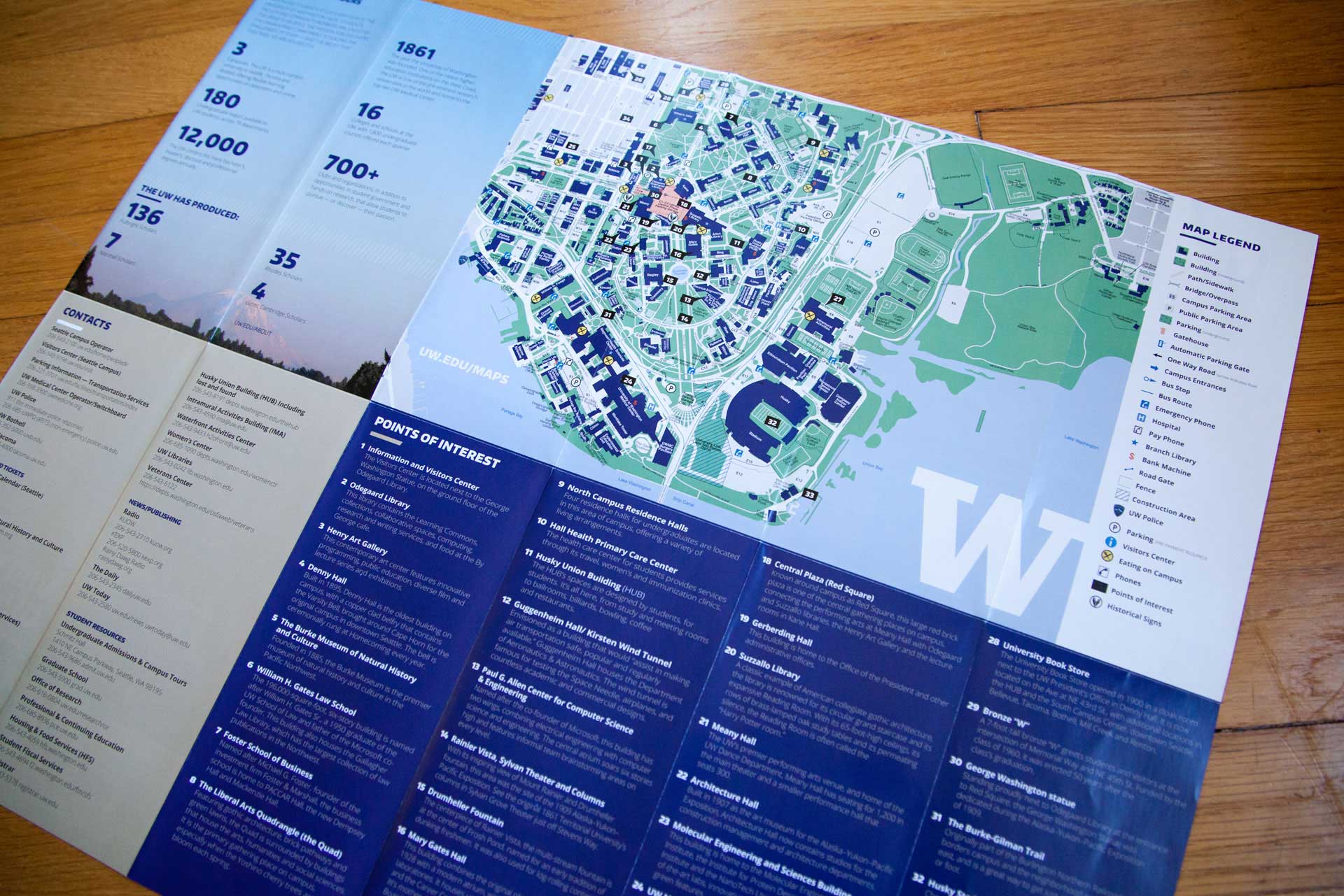 The guide showcases a large map and points of interest throughout the University of Washington campus that helps visitors navigate while learning a little about the area.